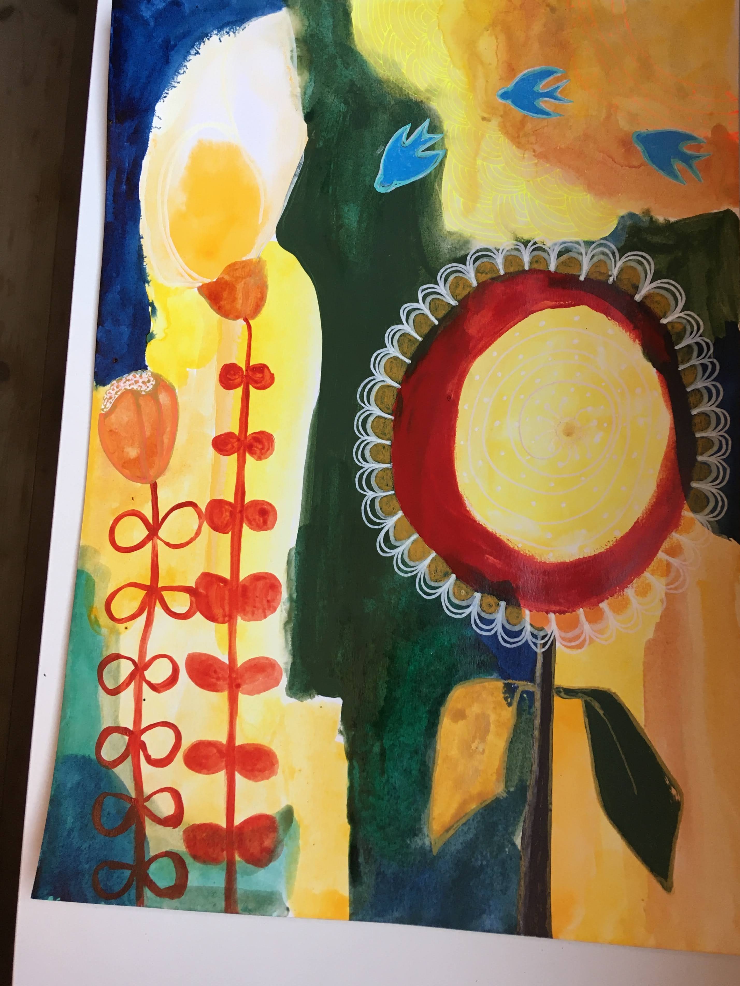 Her er et bilde jeg malte for noen år siden, det har ligget og modnet for seg selv, og nå viser jeg det til deg. Dette bildet gir meg en herlig følelse av rufsete start, hvordan noe blir til foran øynene mine og overrasker meg, dersom jeg gir meg hen til øyeblikket og gir slipp på kontrollen. Det minner meg om kraften i kontraster, og om at fugler er magiske vesner som velsigner oss med sin tilstedeværelse.